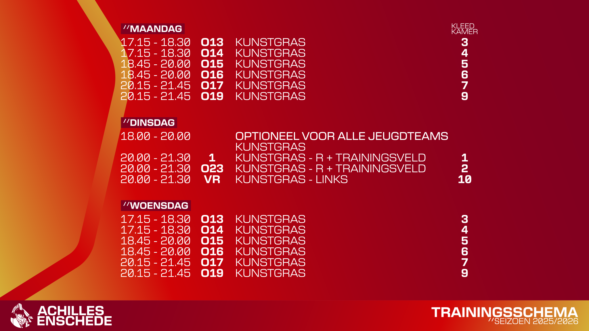 Op deze pagina vind je het trainingsschema 2025/2026. In dit schema zie je wanneer en hoe laat onze teams dit seizoen trainen.